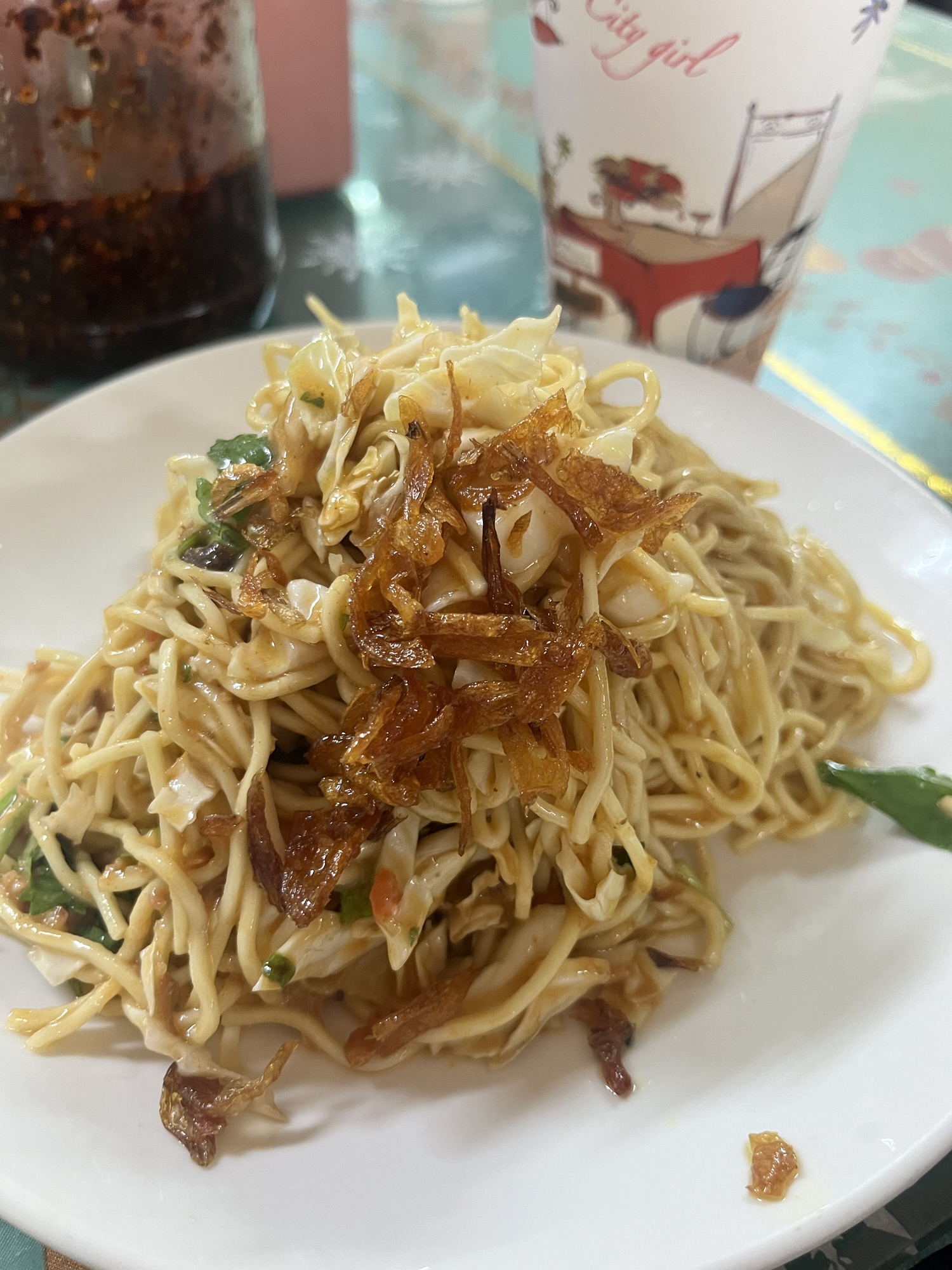 反而店內賣的緬甸風味仰光果酸乾拌麵,份量80元一大盤,搭配桌上的炒辣椒,酸甜滋味加上辣椒香,解膩又順口,非常推薦這個吃法。